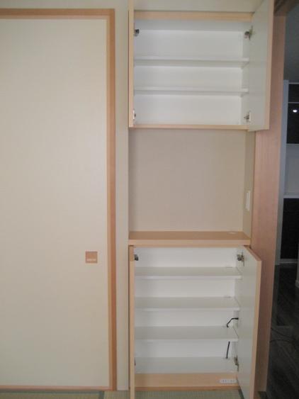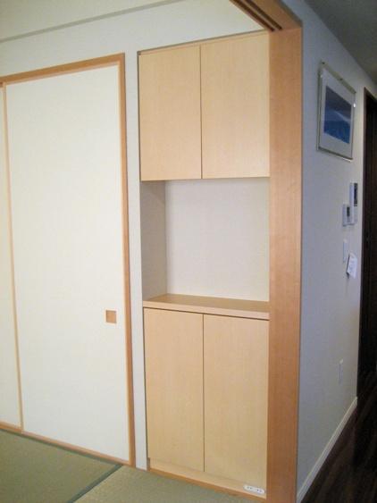 和室のくぼみにピッタリ収めた和室収納棚。コンセントも内蔵しています。