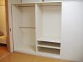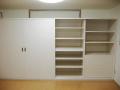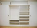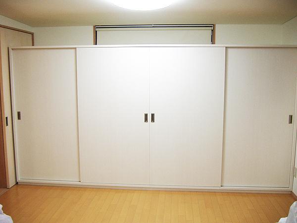 高窓の位置に合わせて、壁一面に造り付けたクローゼット。引き戸使用で、部屋スペースを有効につかえるリビング家具です。