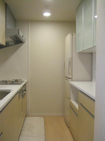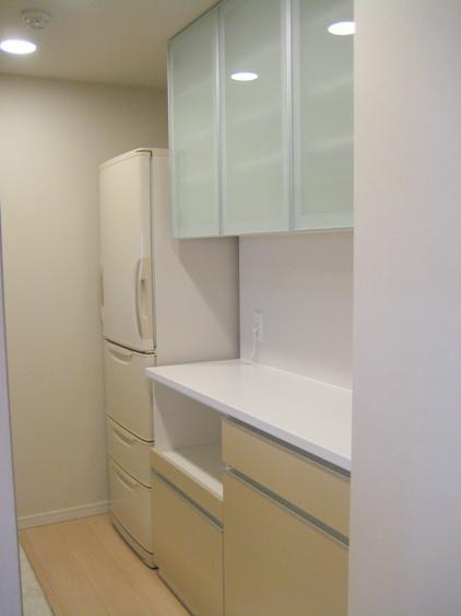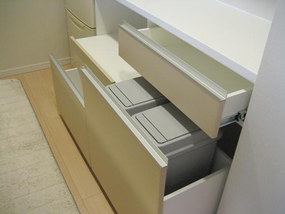 ■ オリジナル食器棚 【キッチン面材合わせ】川崎市の新築マンションにお住まいのKさま。キッチンの面材に合わせてオリジナルの食器棚を製作しました。ガラス扉のアルミフレーム とアルミの取っ手を合わせて統一感を出しました。ゴミ箱も収納できて、明るくモダンな印象です。