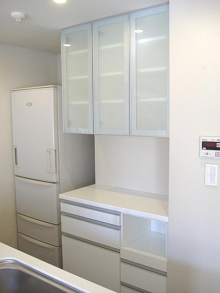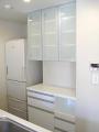 ■オーダーメイド食器棚 【キッチン面材合わせ】 世田谷の新築マンションにお住まいのNさま 。 キッチンのスペースに合わせて、オーダーメイドで製作しました。 シンプルで明るくモダンな食器棚に仕上がりました。アルミフレームの硝子扉、下台はゴミ箱も収納できるためキッチンが広く感じられます。