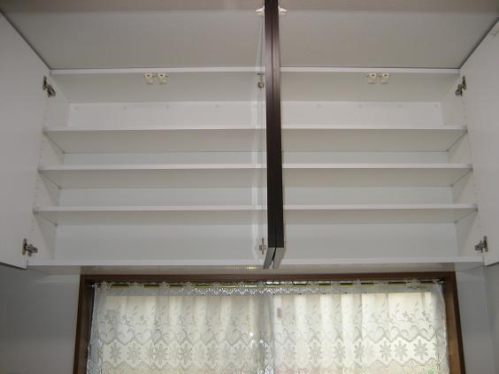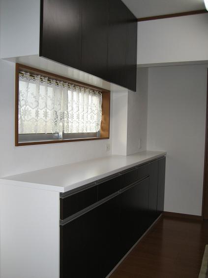 ■ オーダーメイド食器棚群馬県にお住まいのCさま。 壁の凹凸に合わせてセパレートタイプのキッチンボードを製作しました。大型のゴミ箱が6個も収納されているためキッチンがスッキリしました。