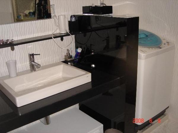 洗面台と洗濯機の間に仕切り壁を製作しました。 洗面カウンターにとても合っていて、ただの壁ですがとても存在感があります。素材は、光沢のあるメラミン化粧版です。